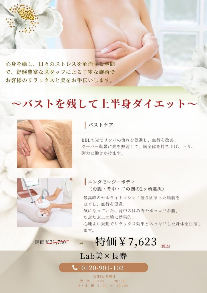 上半身痩せしたいけど、バストも痩せてしまう・・・どうしたらよい?と相談が多い中、Lab美×長寿ではそんなお悩みを解決するべく、特別メニューをご提供いたします💜